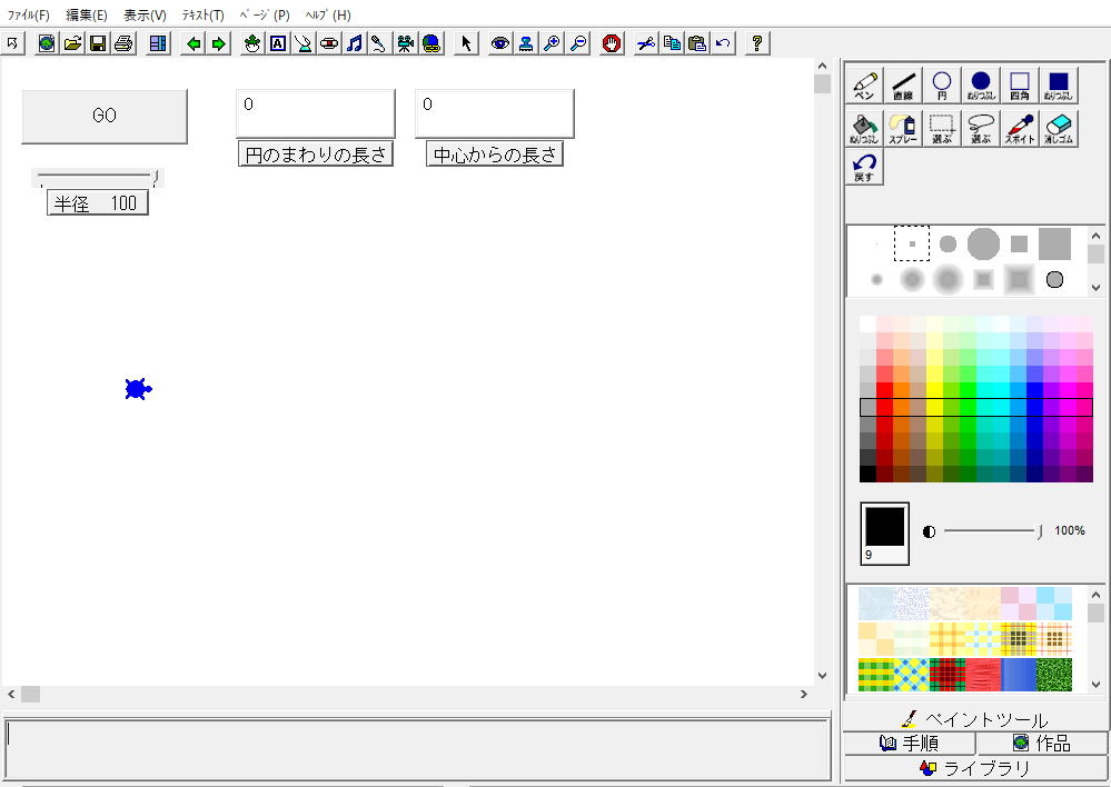直線円のまわりの長さ は、かめ1の中にある 直線 という名前の手順を実行し、円のまわりの長さを 変数に渡し、青い線をかきます。