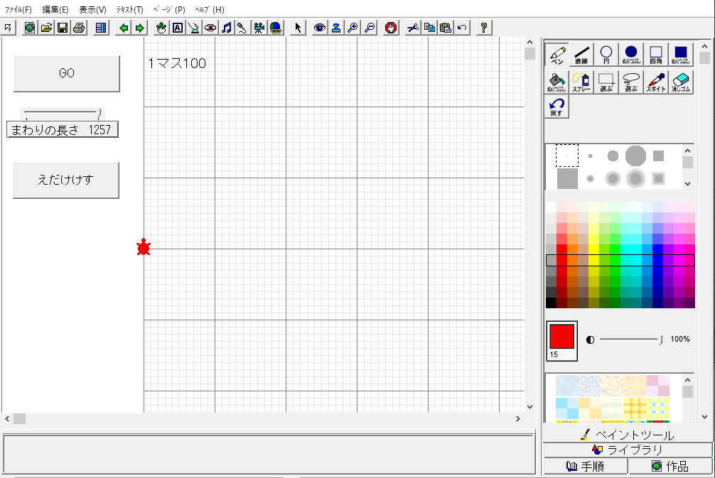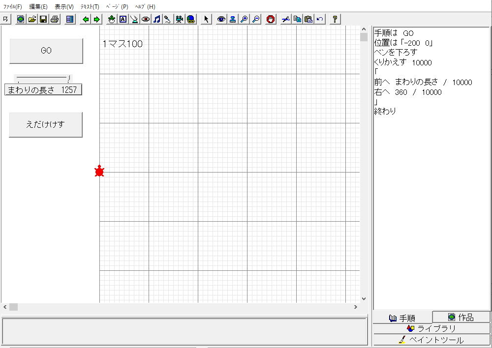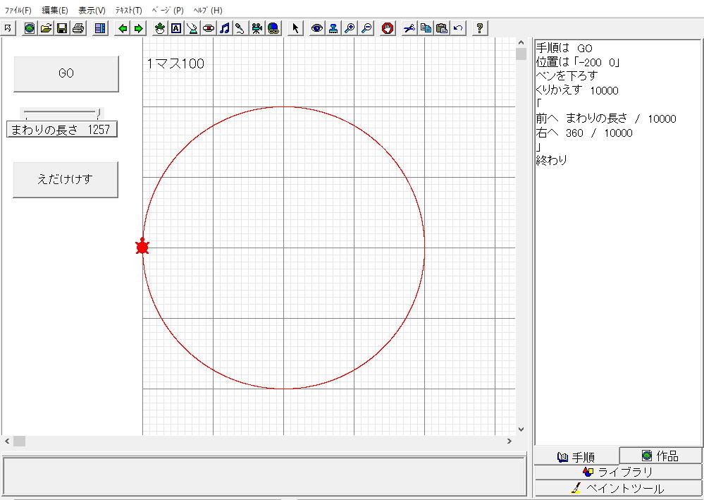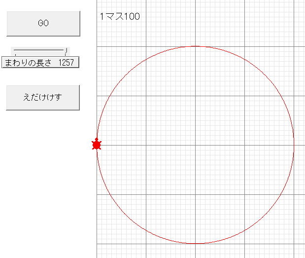 1.もとの円のまわりの長さ 2.手順にプログラミング 3.円をかく |