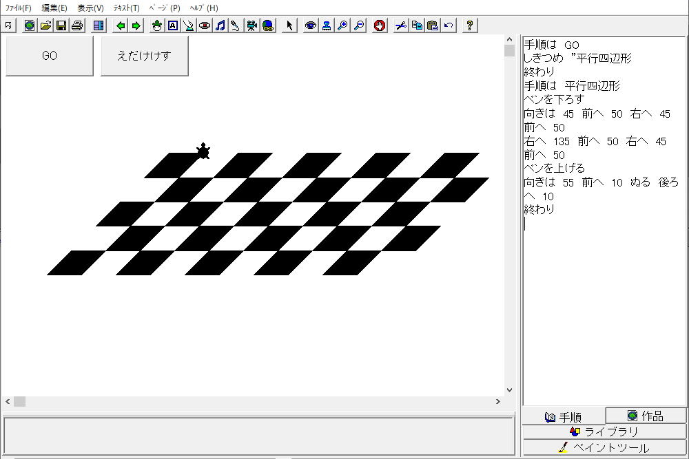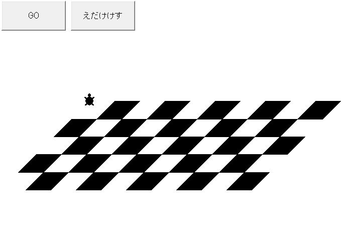 しきつめ”平行四辺形 は、かめ1の中にある しきつめ の手順を使って、くりかえし 平行四辺形 の手順を実行して、しきつめます。
