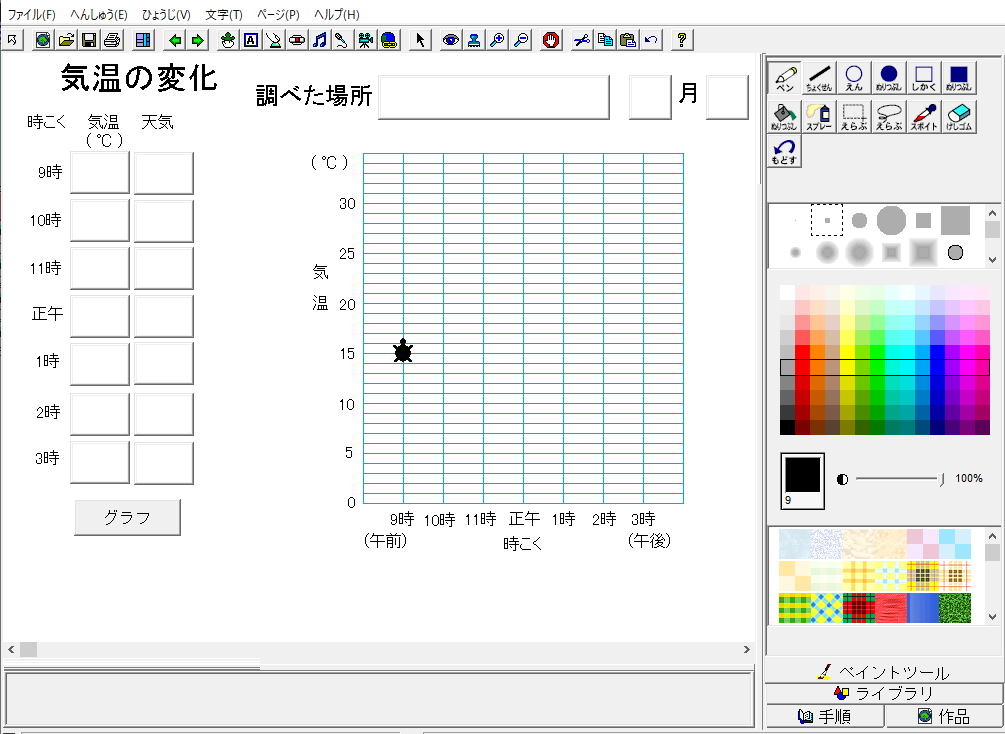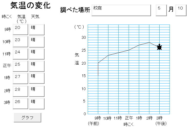 | 気温の変化 カメの位置をかえて、おれ線グラフをつくりましょう。 |