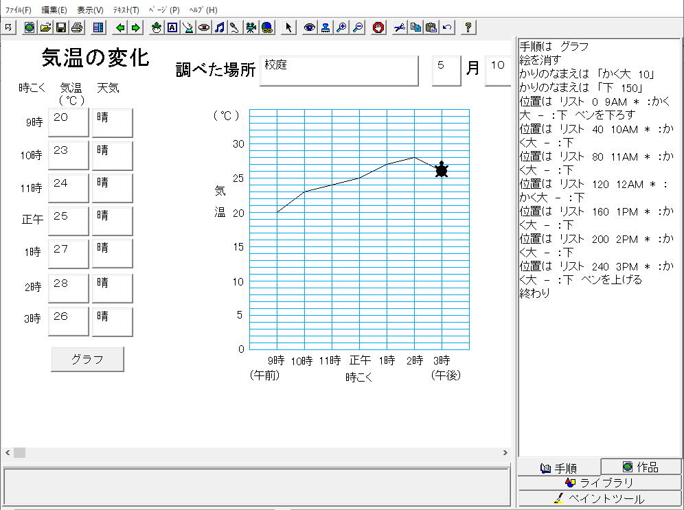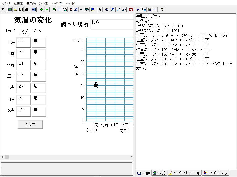 1.もとの気温の変化を開く 2.グラフのデータを入れる 3.手順タブエリアにプログラミング 4.グラフをつくる |