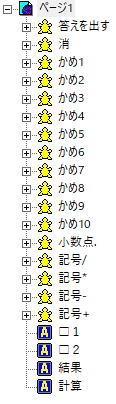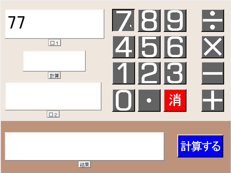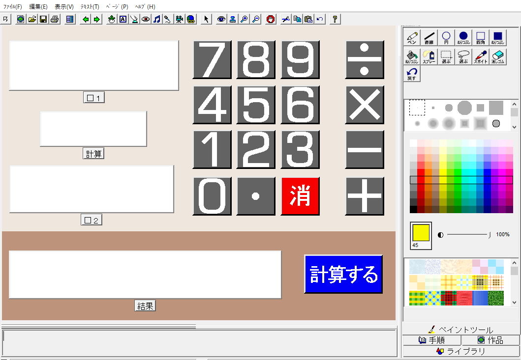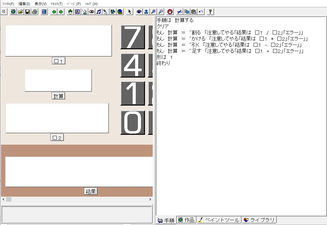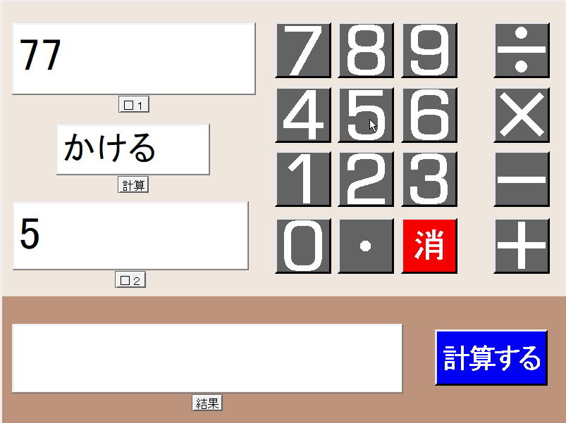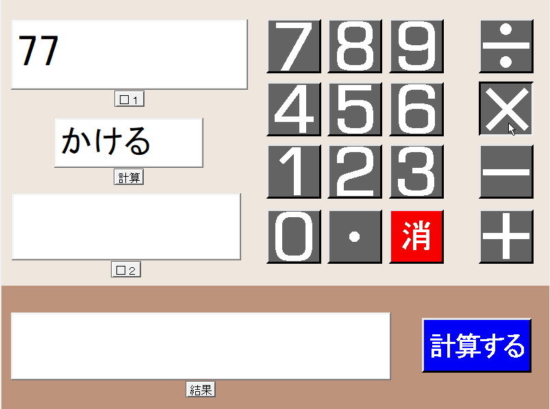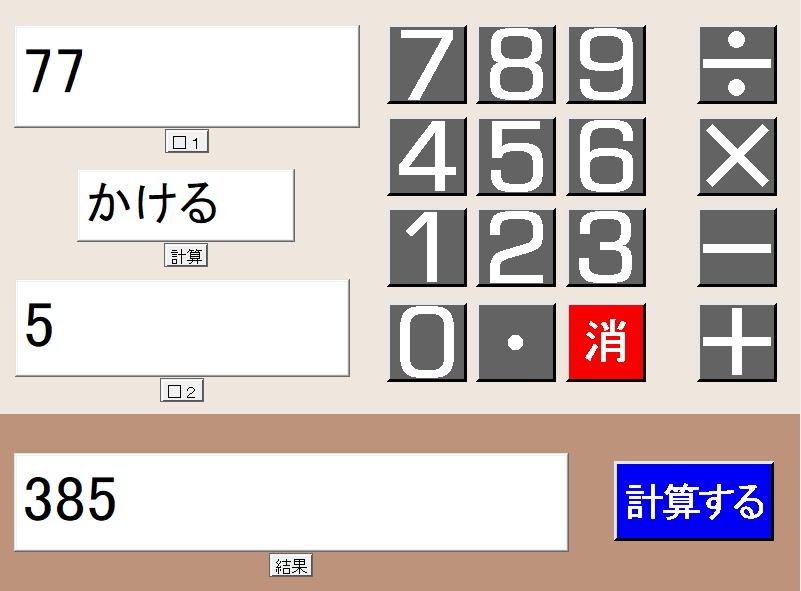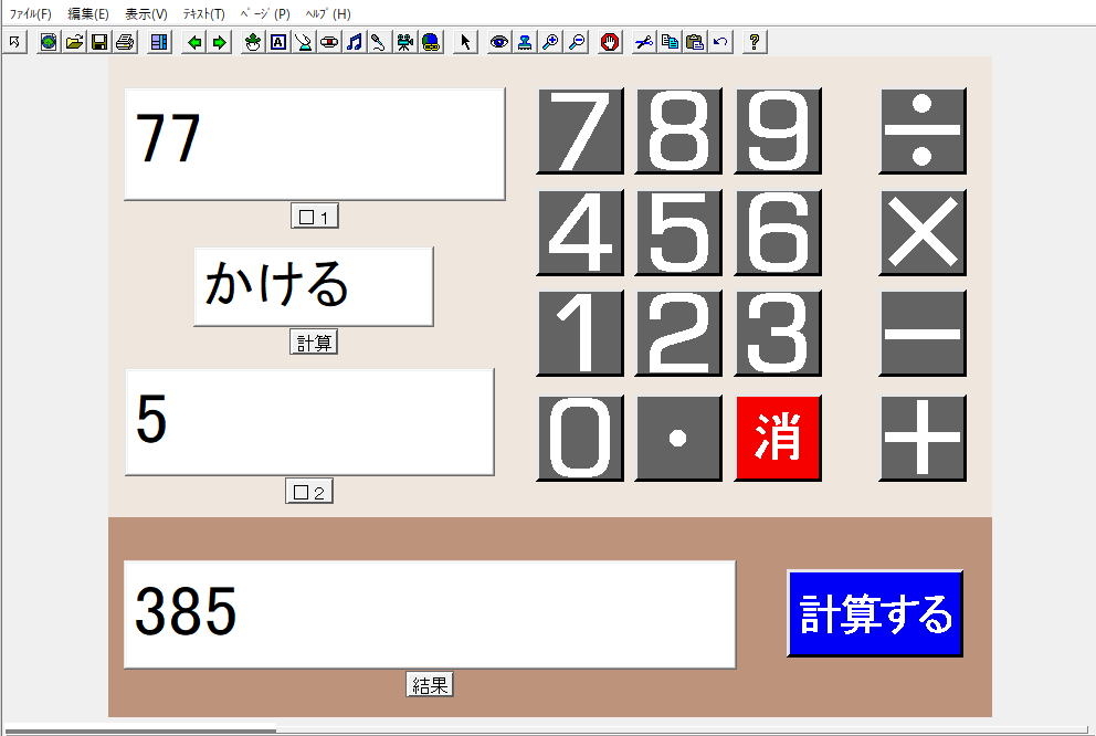 | < テキストボックスの □1 、 □2 、 結果 には、数字を入れかえて変数として使っています。 テキストボックスに数字を書くと、数字としてあつかい計算ができます。数字をあつかう変数を数字変数とよびます。 テキストボックスの 計算 には、文字を入れかえて変数として使っています。文字をあつかう変数なので、文字変数とよびます。 数字変数と文字変数をかけ算したり割り算したりしようとするとエラーなります。空のテキストボックスは、数字変数か文字変数かのくべつができないので、これも計算しようとするとエラーになります。 |